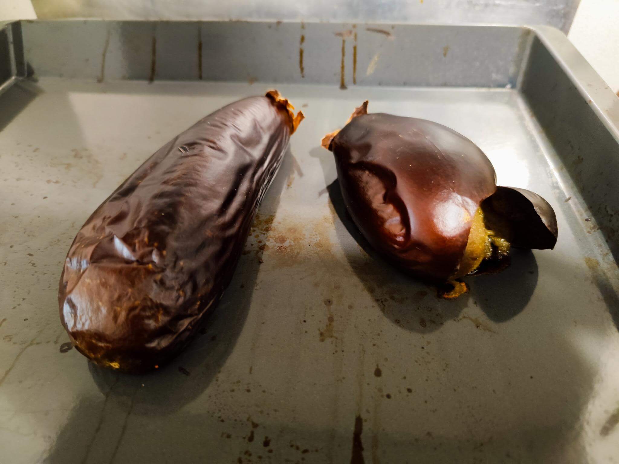 Faire cuire au four 2 aubergines entières à 200°C jusqu'à ce qu'elles soient un peu brulées sur la peau.