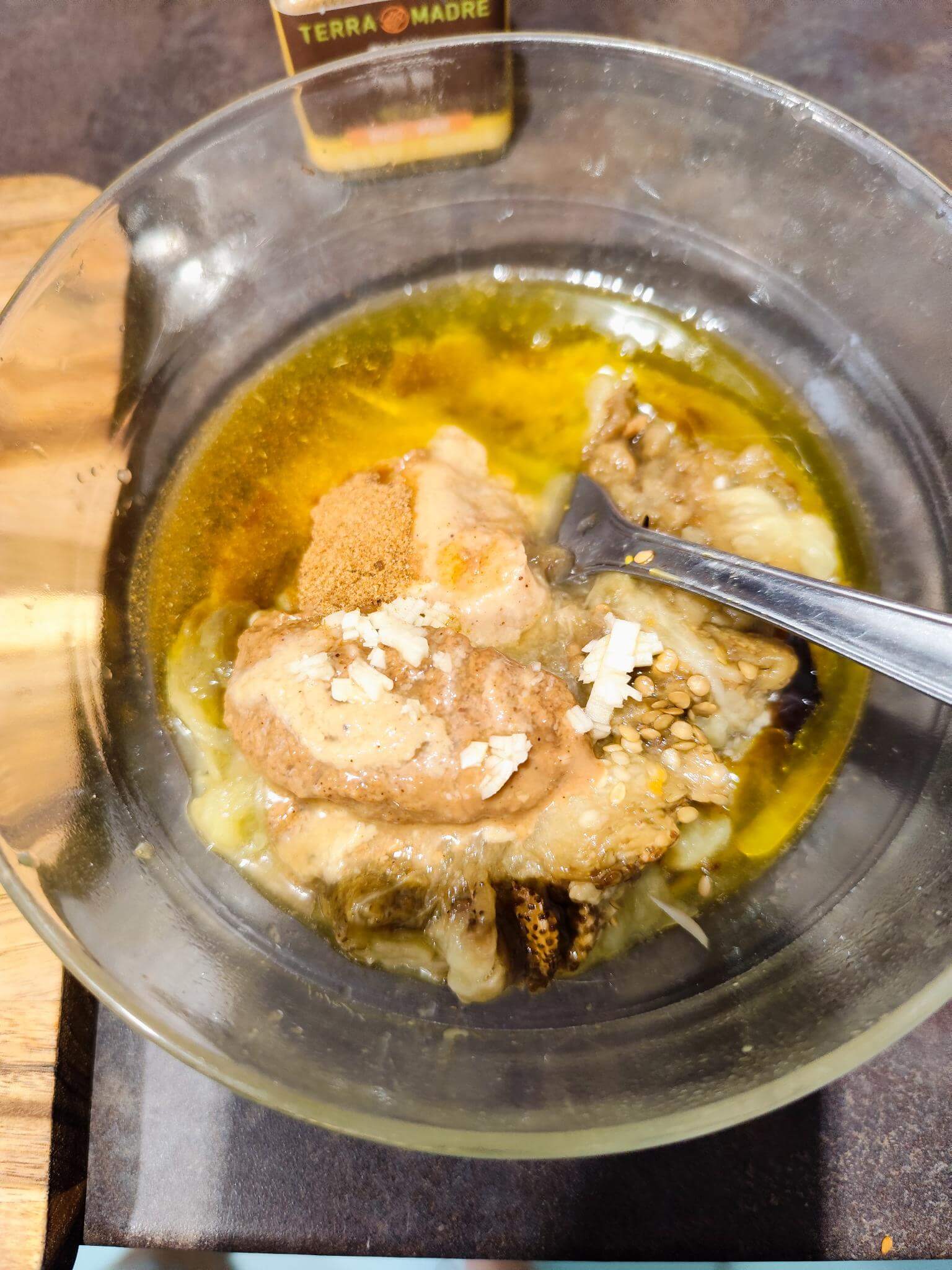 Dans un saladier, mettre la chair des aubergines, de l'ail, du jus de citron, de l'huile d'olive, un yaourt, du tahini et du cumin et bien touiller avec une fourchette.