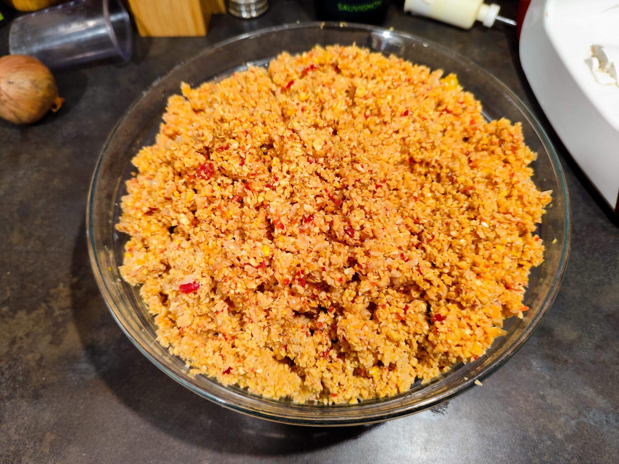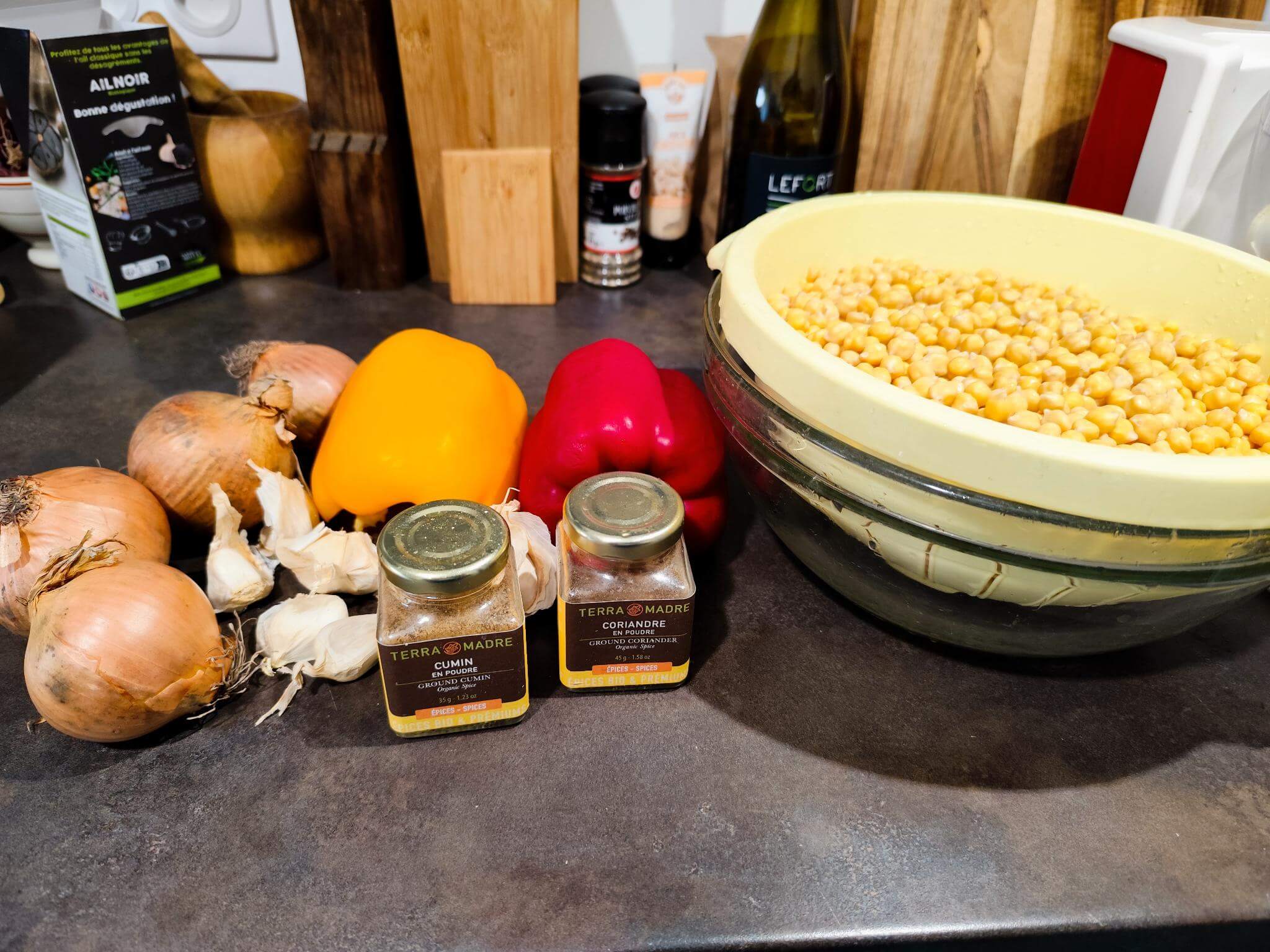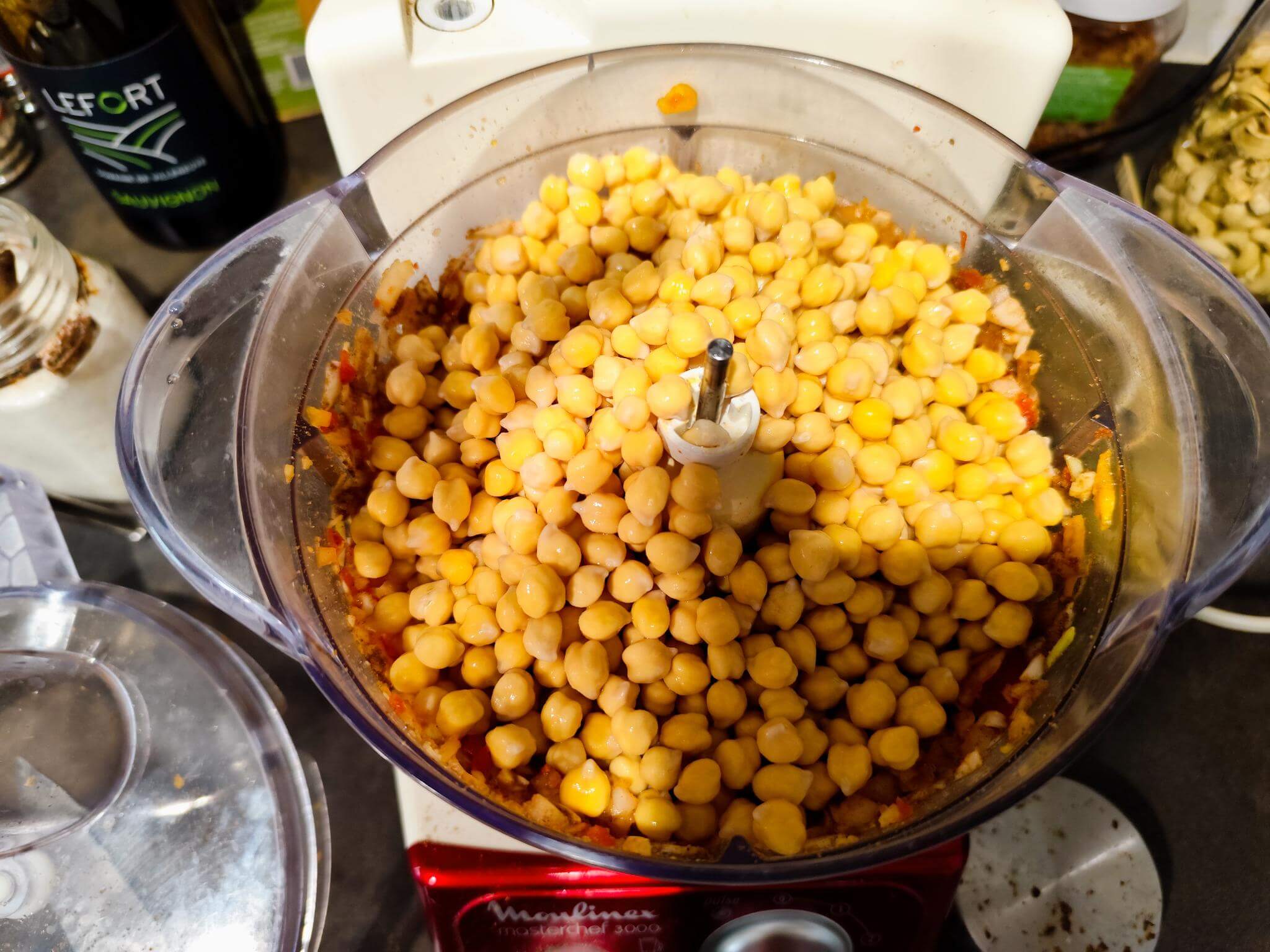 Je prépare les falafels avec de l'oignon, de l'ail et des poivrons. Normalement, je mets aussi du persil, mais là j'en avais pas.