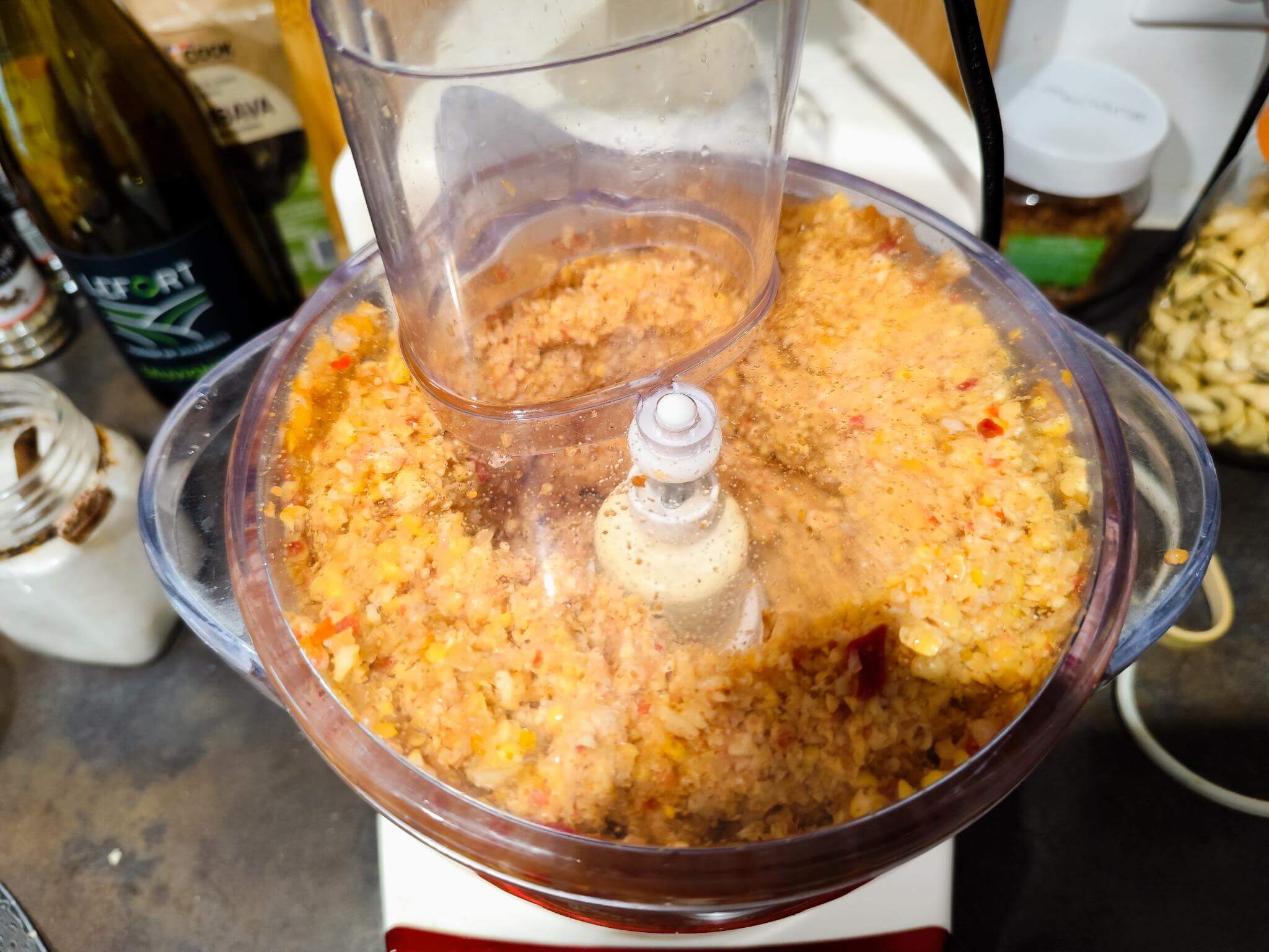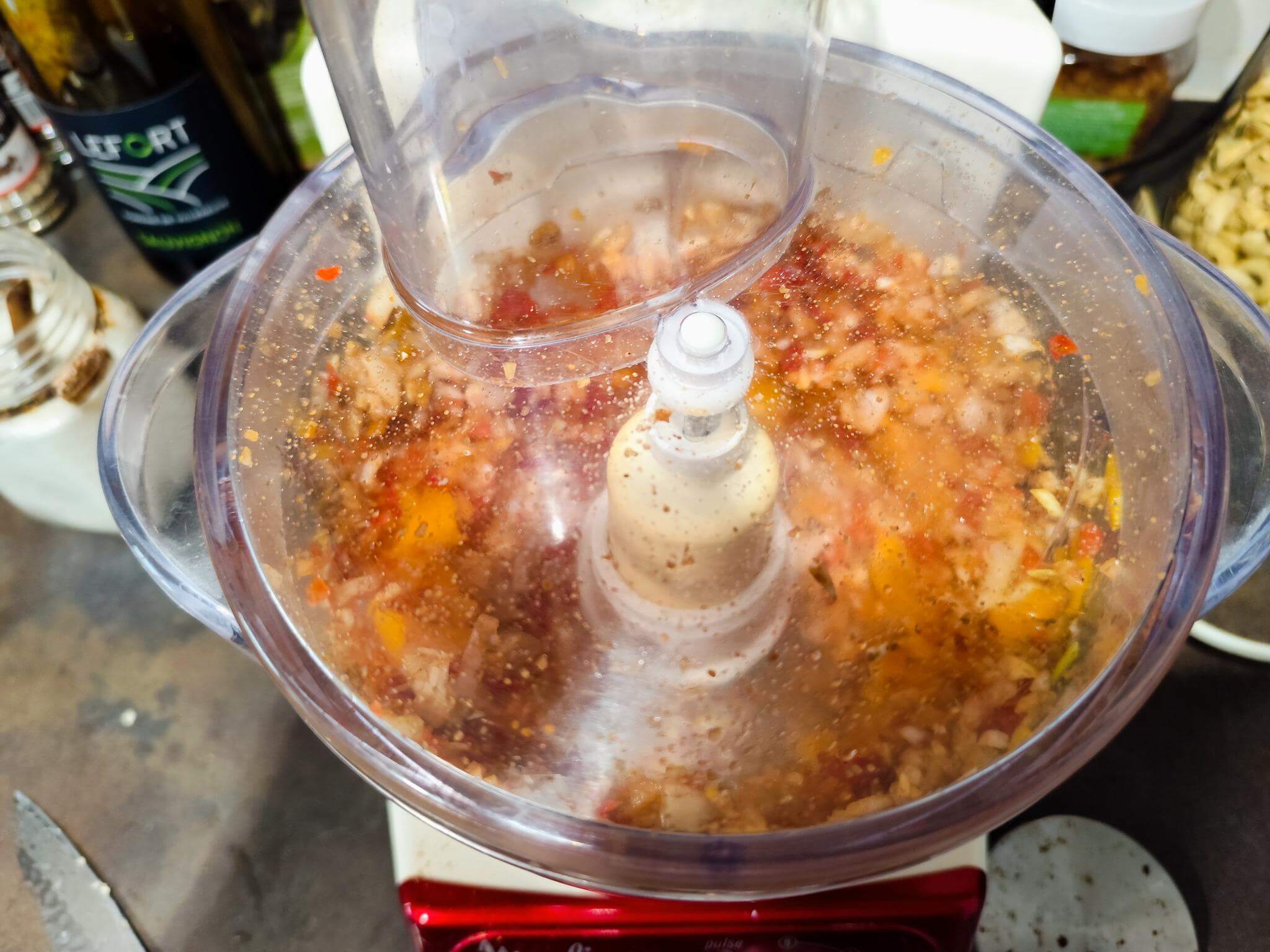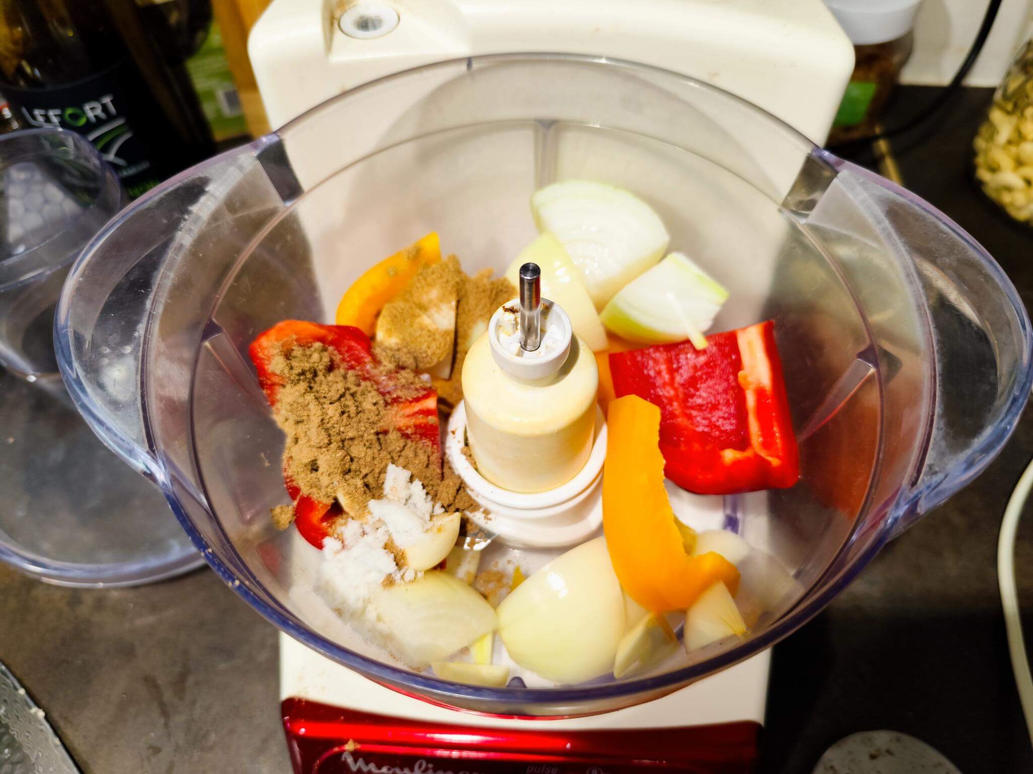 D'abord, je mixe l'oignon, le poivron et l'ail.