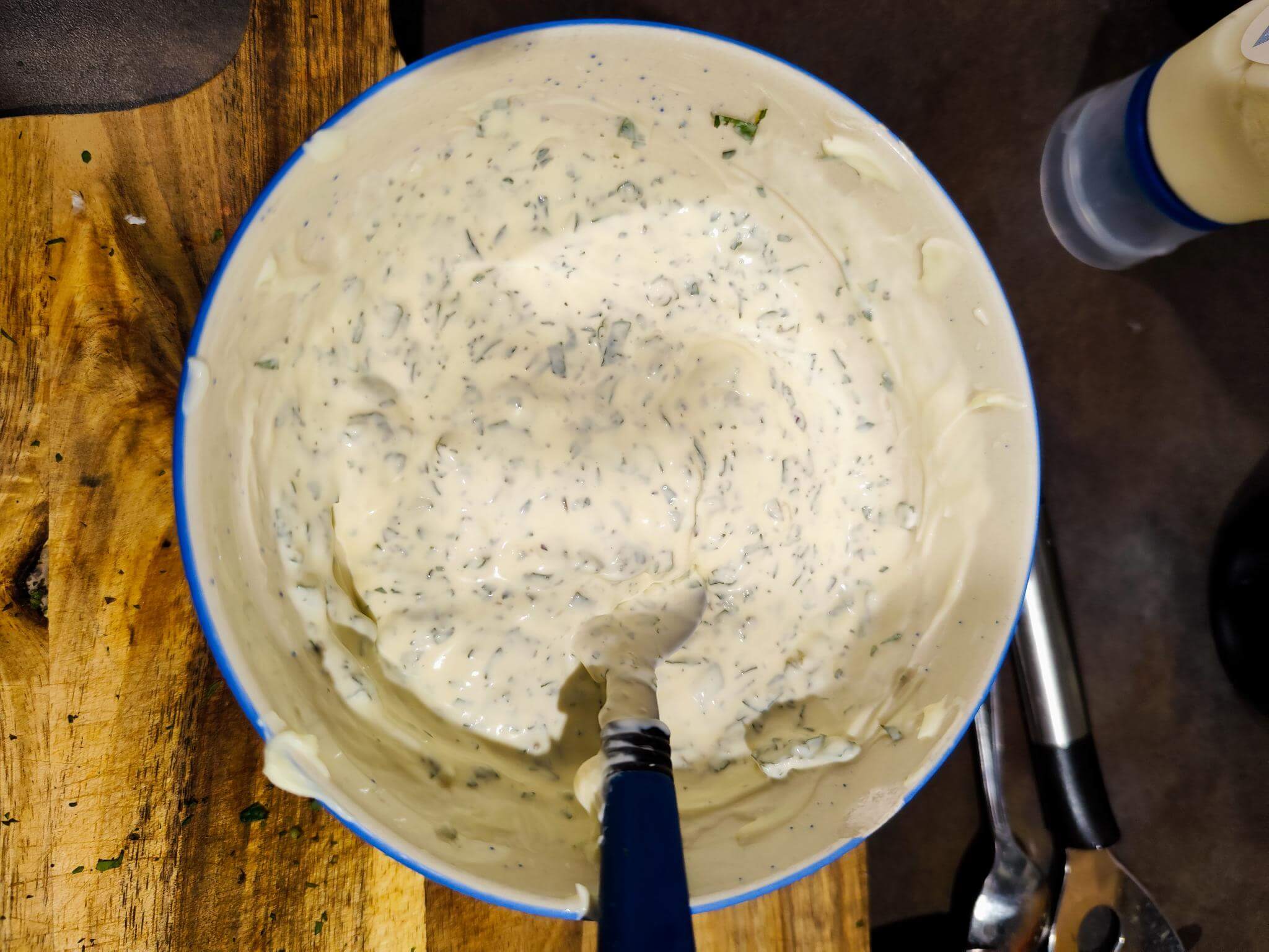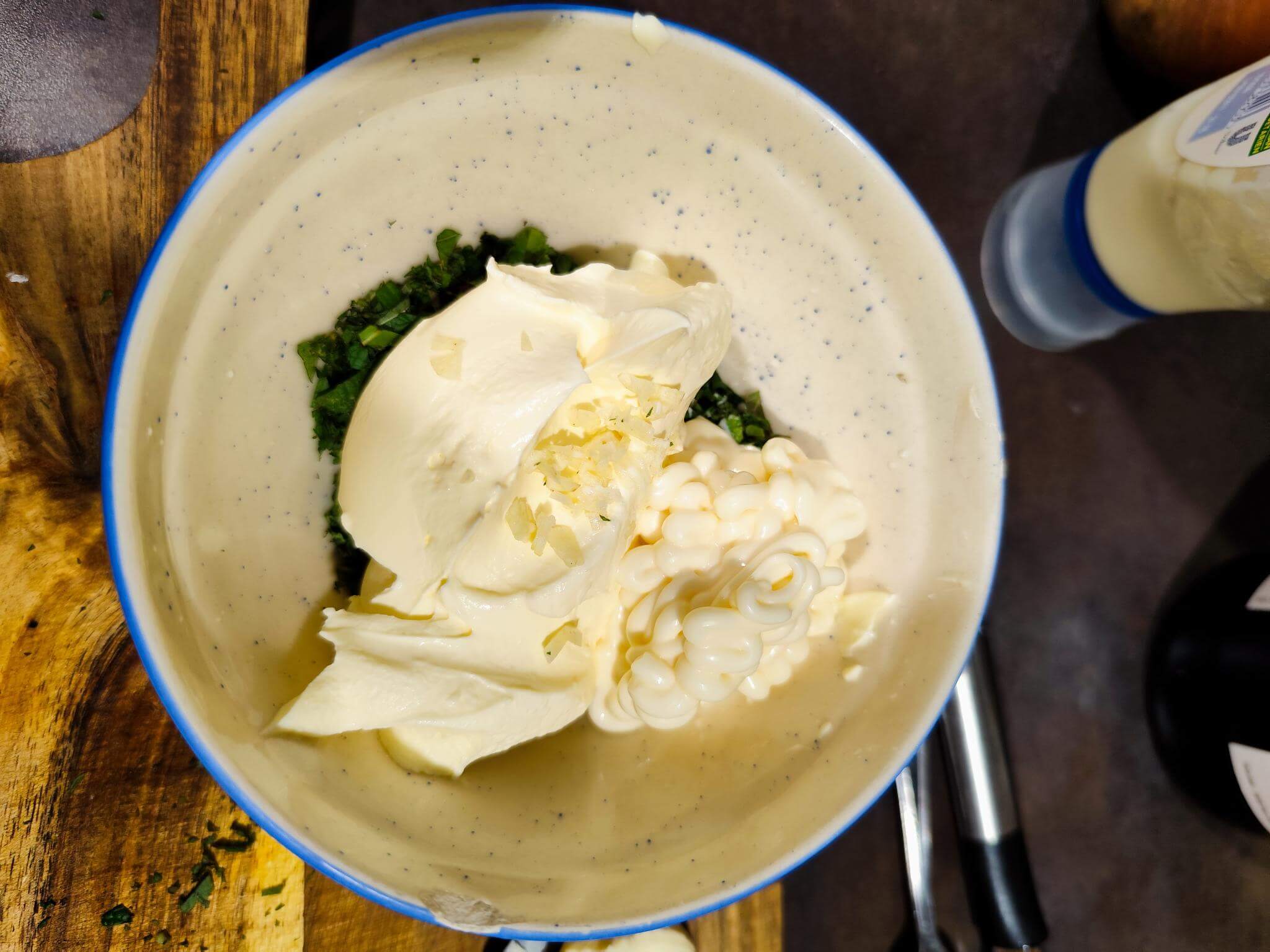 Pour la sauce blanche, je mélange 50% crème fraiche (ou yaourt grec) et 50% mayonnaise, auquel on ajoute de l'ail et de la menthe.